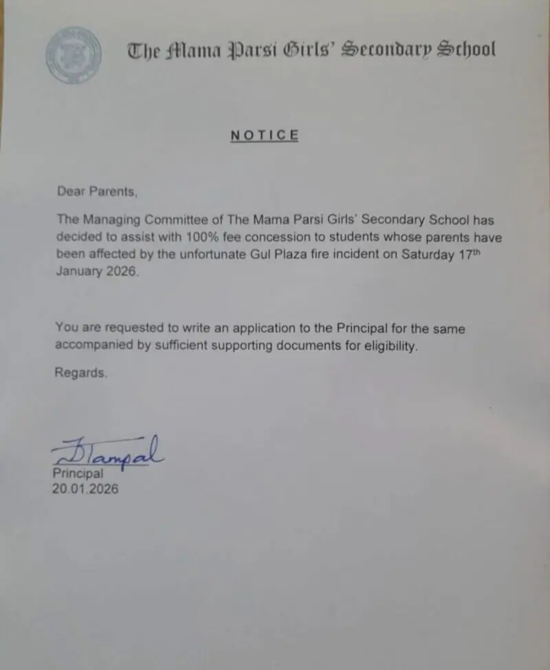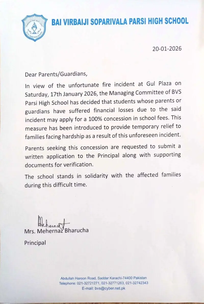 The Bai Virbaijee Soparivala (BVS) Parsi High School offered 100 per cent concession in school fees to students whose parents or guardians suffered financial losses in the Gul Plaza blaze.